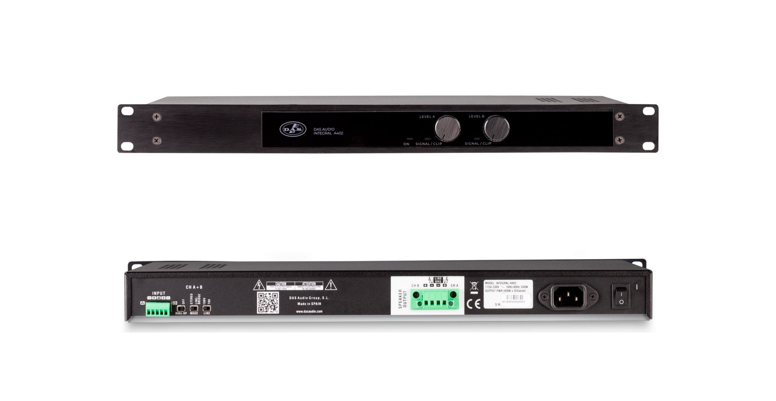 INTEGRAL-A402 es un amplificador de alta eficiencia y tecnología clase D de dos canales, 1U de rack de altura para uso en instalación comercial y profesional. Está equipado con una fuente de alimentación conmutada universal capaz de trabajar en todo rango en cualquier país del mundo y funcionalidad de stand-by automática cuando no hay presencia de señal, lo cual permite ahorrar consumo energético.